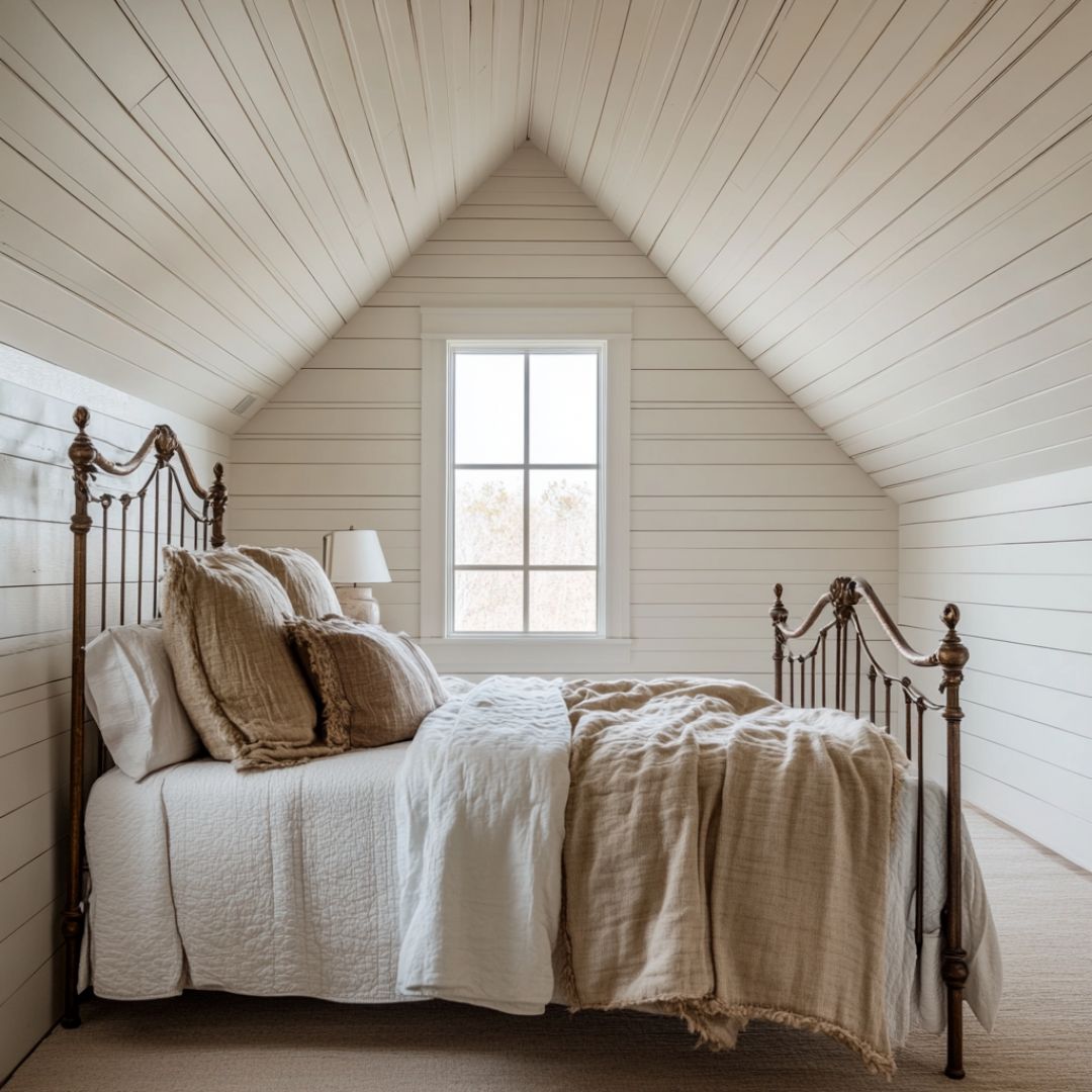 The primary bedroom is a peaceful sanctuary, featuring vaulted ceilings and whitewashed shiplap walls that create an airy and serene atmosphere. A wrought-iron bed, draped in luxurious linens, serves as the focal point of the room, inviting rest and relaxation. The combination of rustic and refined elements ensures that this bedroom is both comfortable and stylish, providing a tranquil escape from the outside world. Thoughtful touches, such as soft lighting and plush textiles, enhance the overall sense of calm and comfort.