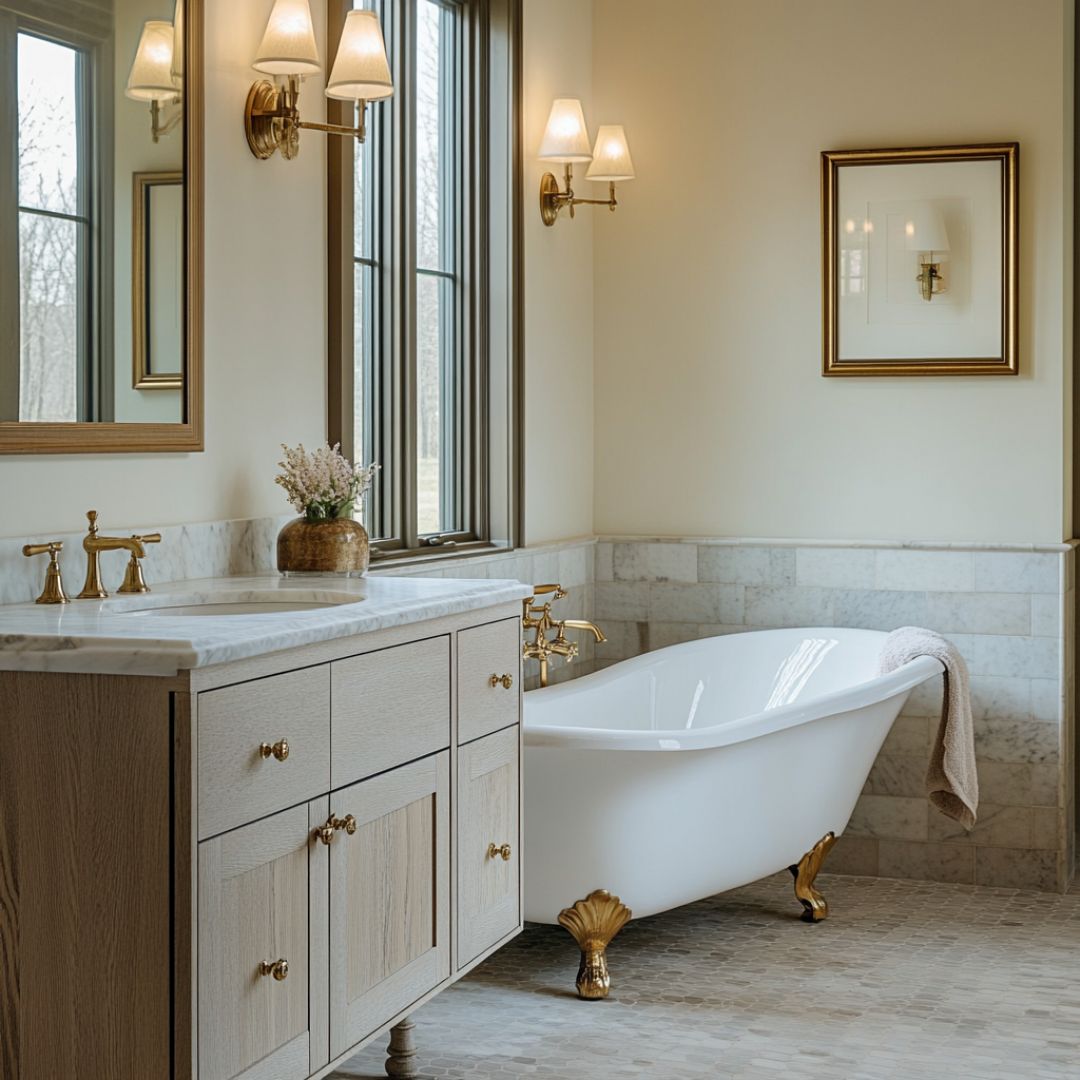 The bathroom offers a blend of timeless elegance and modern functionality, featuring a clawfoot bathtub that invites relaxation. Marble countertops provide a touch of luxury, while antique brass fixtures add a hint of vintage charm. The layout is both practical and stylish, with ample storage and thoughtfully placed lighting that enhances the overall atmosphere. Subtle color schemes and high-quality materials ensure that this bathroom is a serene and inviting space, perfect for unwinding at the end of the day.