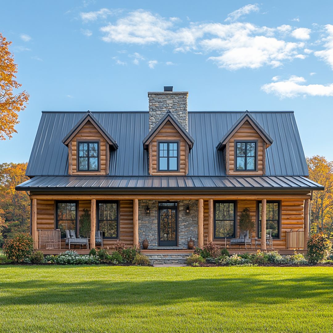 The exterior of this woodland lodge is a testament to timeless design, with its striking gabled roof and gray metal siding that contrasts beautifully against the warm tones of the wooden logs. The front facade is adorned with three gabled dormers, each featuring large windows that invite natural light into the home. A wraparound porch, supported by sturdy log columns, offers an inviting outdoor living space perfect for enjoying the surrounding natural beauty. The stone chimney serves as a central focal point, drawing the eye to the heart of the lodge, while the well-manicured lawn and vibrant foliage complete the picturesque setting under a bright, blue sky.