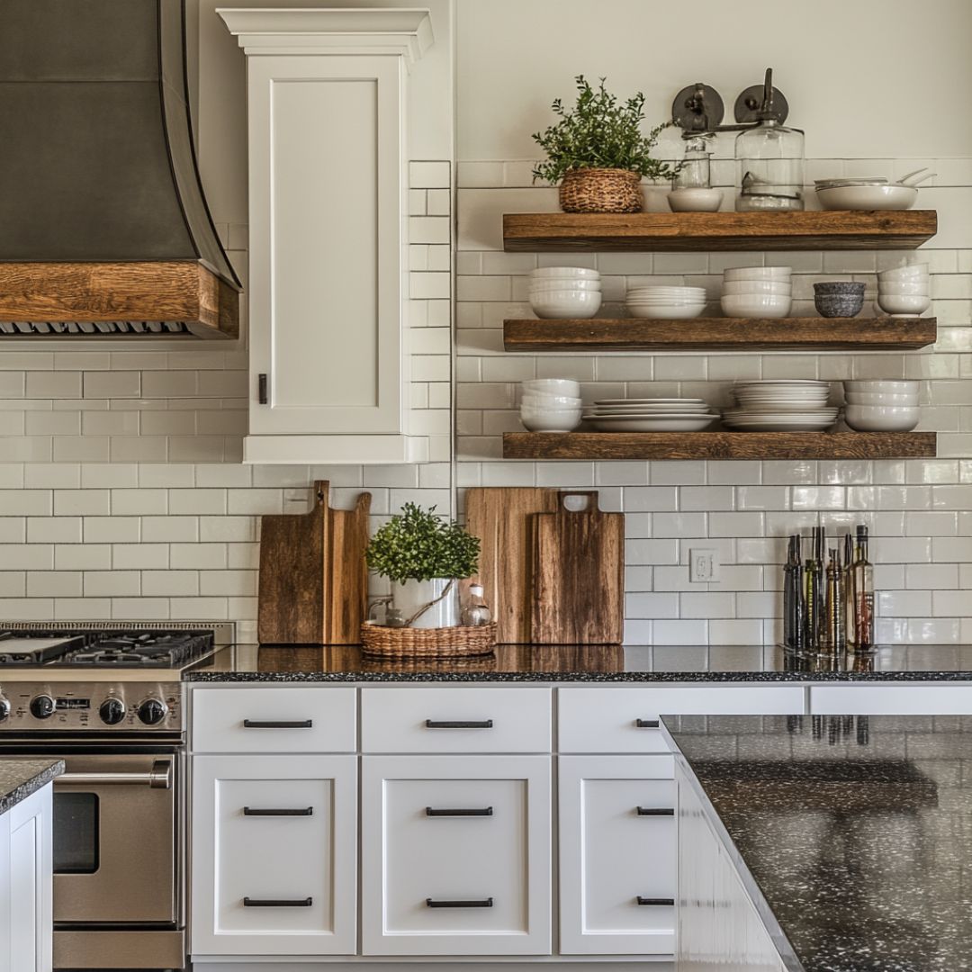 In the kitchen, the blend of traditional and modern elements creates a space that is both functional and aesthetically pleasing. White shaker cabinets provide a crisp, clean backdrop, while dark granite countertops add a touch of sophistication. A handcrafted tile backsplash introduces a splash of color and texture, complementing the stainless steel appliances and open shelving made from reclaimed wood. This kitchen is designed for both the avid cook and the casual entertainer, offering ample space and style for all culinary endeavors.
