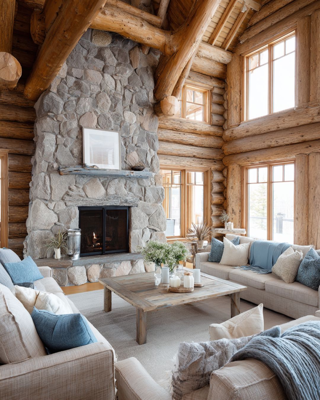 Upon entering the cottage, you are greeted by a living area that embodies a serene and rustic coastal aesthetic. At its heart lies a large stone fireplace, offering a cozy yet sophisticated ambiance. Neutral-toned furniture adorned with soft blue and sandy accents complements the robust timber logs of the walls, creating a warm and inviting atmosphere. Large windows allow natural light to flood the space, enhancing the connection between the interior and the surrounding nature.