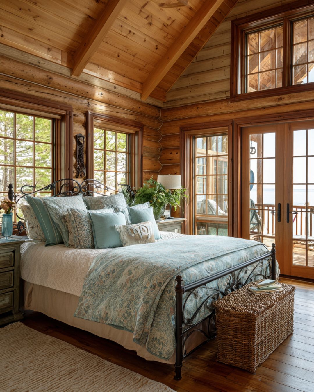 The bedroom is a tranquil retreat designed to offer the ultimate in relaxation. Natural wood paneling lines the walls, creating a warm and inviting atmosphere. A wrought-iron framed king-sized bed takes center stage, adorned with soft linens in ocean-inspired hues. Large windows and French doors lead out to the deck, blurring the lines between indoor and outdoor living. The decor is minimal yet impactful, with elements that nod to the coastal theme of the cottage.