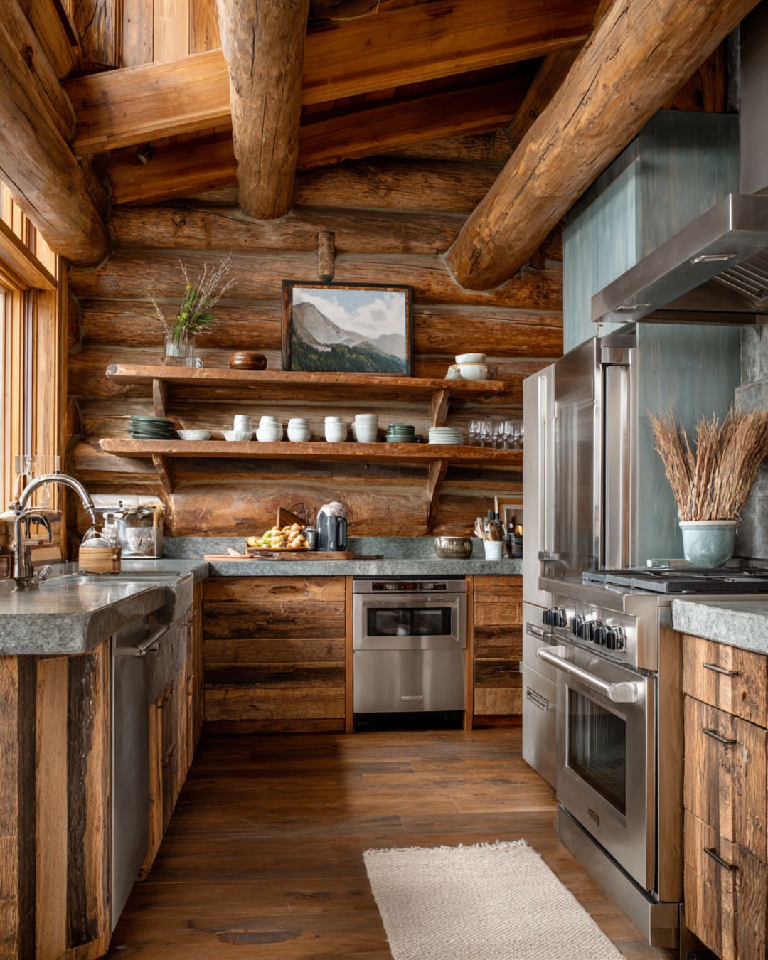 The kitchen is a masterful combination of luxury and rustic charm, featuring high-end stainless steel appliances that contrast beautifully with the reclaimed wood cabinetry. Polished granite countertops offer a sleek and practical workspace, while open shelving displays an array of charming crockery. The color palette of natural wood tones and subtle blues creates a cohesive look that is both sophisticated and welcoming. It's a space where culinary creativity can flourish, surrounded by the beauty of nature.