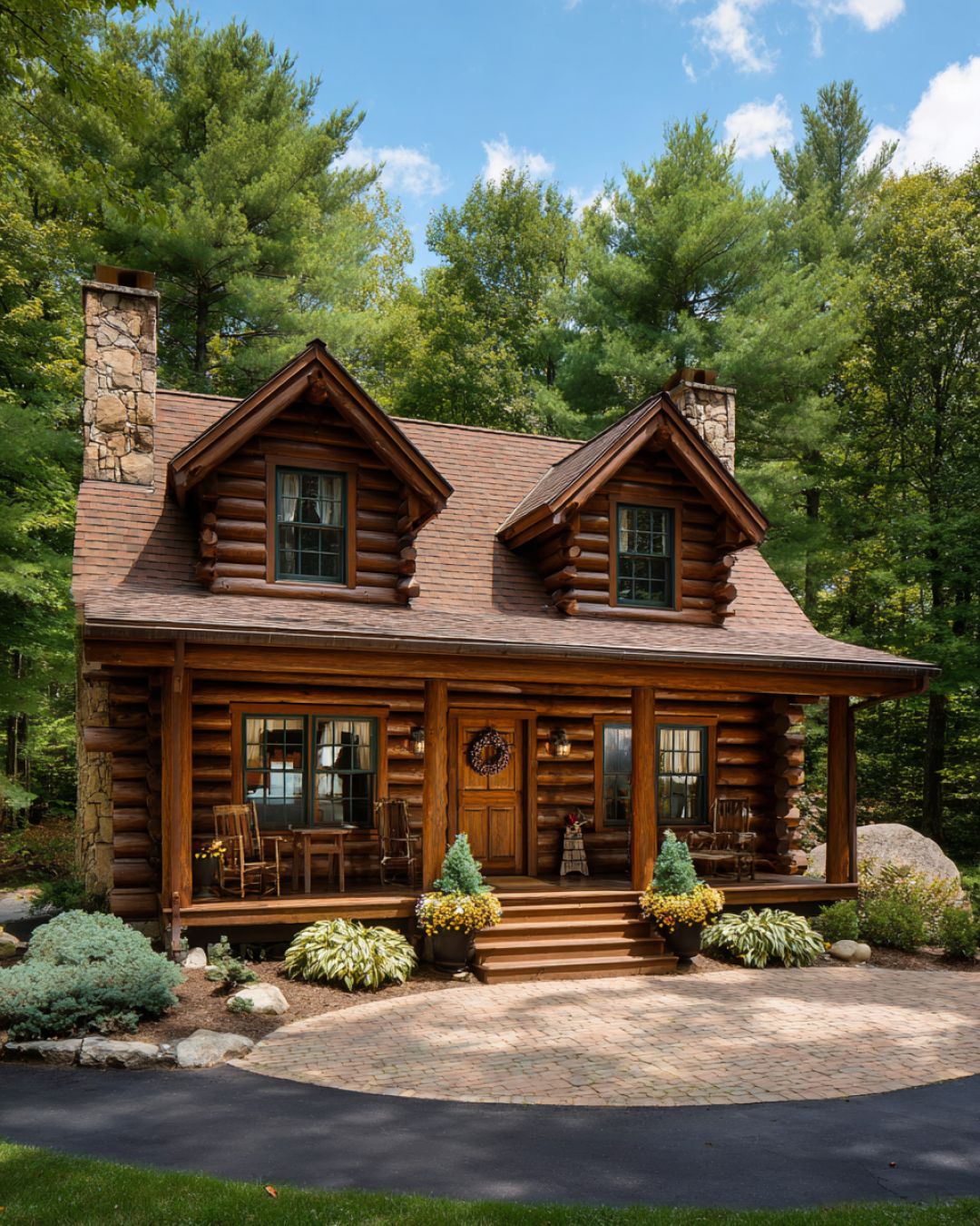 The image presents a delightful log cottage nestled within a lush forest, exuding a sense of warmth and tranquility. Crafted from sturdy, round logs, the cottage showcases a rustic and inviting look with its symmetrical design, two charming dormer windows, and a stone chimney at each end. The rich brown hues of the logs contrast beautifully with the surrounding greenery, while a well-kept, paved circular driveway leads to the front steps, bordered by potted plants and carefully tended shrubs. The welcoming porch is decorated with simple, rustic wooden furniture and a wreath on the door, enhancing its family-friendly appeal. In the background, the dense forest stretches out under a clear blue sky, adding to the peaceful atmosphere.