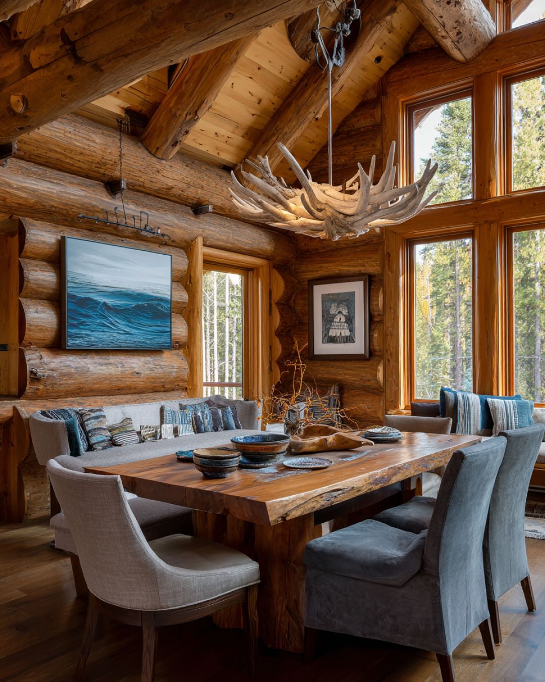 The dining room is a captivating blend of rustic charm and elegant design. A handcrafted wooden table stands as the centerpiece, surrounded by comfortable seating that invites long, leisurely meals. Above, a driftwood chandelier casts a gentle glow, adding a whimsical touch to the space. Maritime artwork adorns the walls, serving as a reminder of the coastal inspiration behind the design, while large windows provide stunning views of the forest beyond.