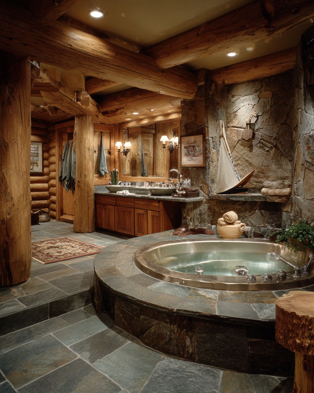 The bathroom offers a spa-like experience, combining natural stone and wood elements to create a serene atmosphere. A large soaking tub invites relaxation, set against a backdrop of stone tiles and wood accents. Nautical accessories add a touch of whimsy, while fixtures in brushed nickel provide a modern contrast. The layout is both functional and stylish, ensuring that every moment spent here is one of comfort and tranquility.