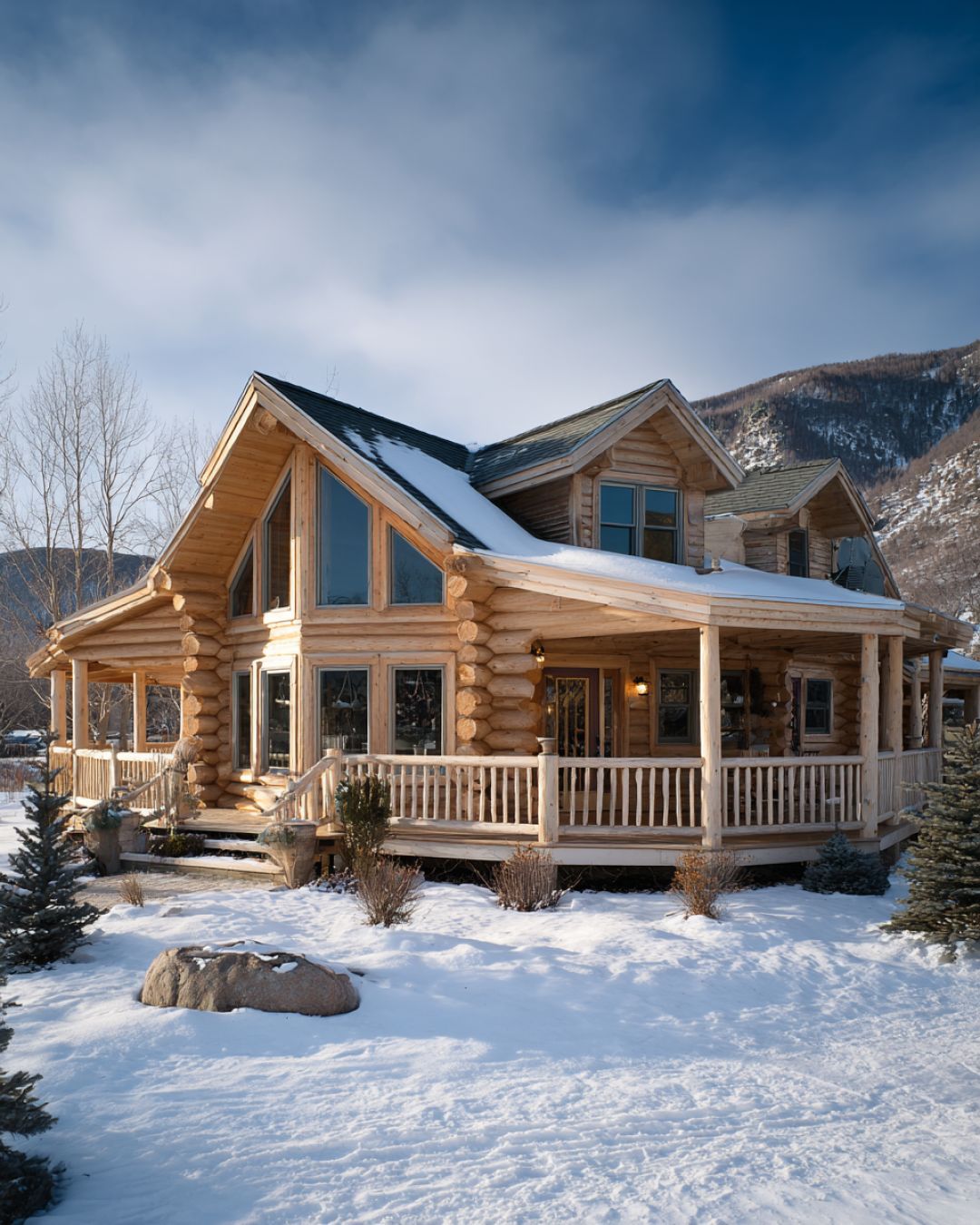 The exterior of the house is a breathtaking vision of light-birch logs, softly rounded to give a gentle, inviting appearance. A snow-kissed front porch wraps around the home, providing a perfect spot to enjoy the crisp winter air and watch the snowfall. The roof, with its gentle slopes, is designed to complement the natural surroundings, creating a harmonious blend with the landscape. Large windows punctuate the facade, allowing natural light to flood the interior while offering panoramic views of the surrounding scenery.
