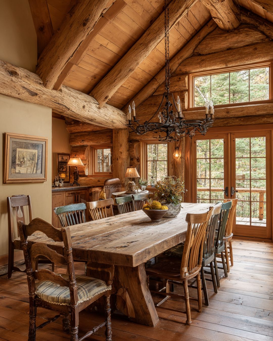 The dining area is a perfect blend of rustic charm and elegant simplicity. A large, handcrafted wooden table sits at the center, surrounded by mismatched chairs that add character and a sense of history. Above, a wrought-iron chandelier casts a gentle glow, illuminating the space with a soft, welcoming light. The walls are adorned with nature-inspired artwork, and a large window offers views of the forest beyond, making every meal feel like a special occasion.