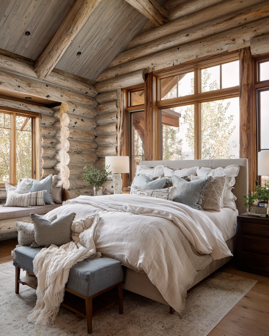 The bedroom is a serene haven, designed with relaxation in mind. The walls, clad in light-birch logs, exude warmth and comfort, while large windows frame the ever-changing views of the outdoors. A plush, king-sized bed takes center stage, dressed in luxurious linens and soft, inviting textures. The color palette is kept neutral, with soft blues and whites that evoke a sense of calm and peace, ensuring that this space is a true retreat from the world.