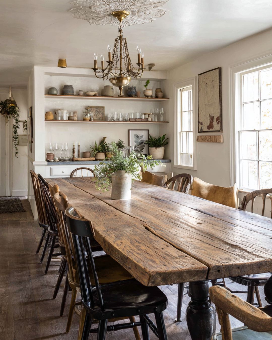 The dining area is a testament to the farmhouse's ability to blend functionality with aesthetic beauty. A large, reclaimed wood table takes center stage, surrounded by a mix of vintage chairs that add character and charm. Above, an antique chandelier provides a gentle, ambient light that enhances the room's warm and inviting atmosphere. The walls are adorned with understated artwork and shelves that display an array of curated ceramics and glassware, adding a personal touch to the space.