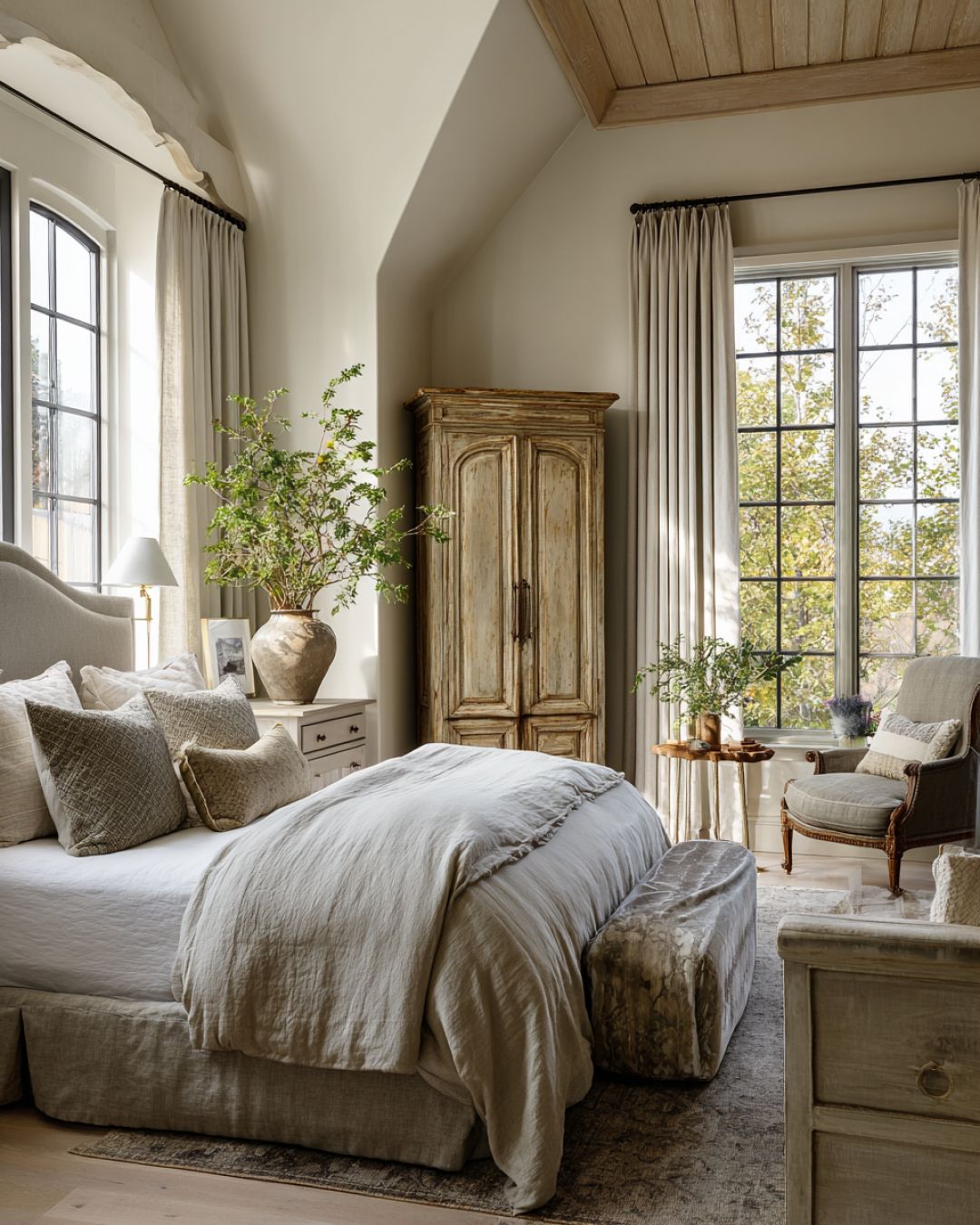 The bedroom is a serene retreat, designed to offer rest and rejuvenation. A plush, upholstered bed anchors the room, complemented by antique side tables and a vintage armoire. Soft, neutral tones dominate the color scheme, creating a calming atmosphere, while luxurious linens and layered textiles add warmth and texture. Large windows allow natural light to fill the space, and thoughtfully placed plants bring a touch of nature indoors.