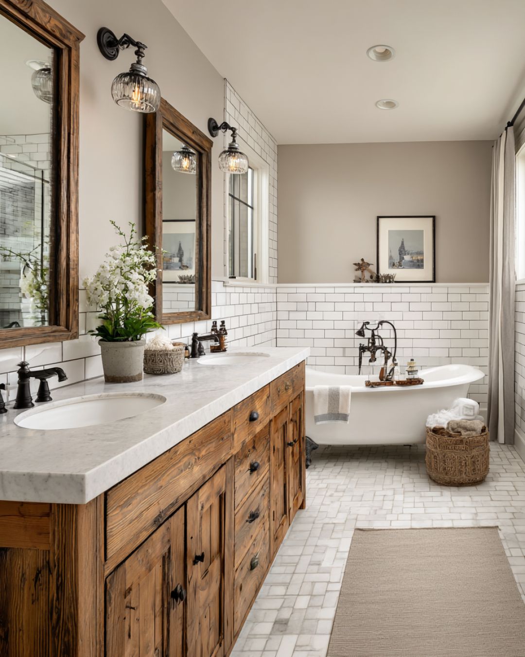 The bathroom is a study in understated elegance, featuring classic materials and a soothing color palette. White subway tiles line the walls, paired with a clawfoot bathtub that exudes vintage charm. The vanity is crafted from reclaimed wood, topped with a sleek stone countertop and elegant fixtures in brushed nickel. Large mirrors enhance the sense of space and light, while carefully chosen accessories add personality and style. The layout is both functional and aesthetically pleasing, offering a space that is as practical as it is beautiful.