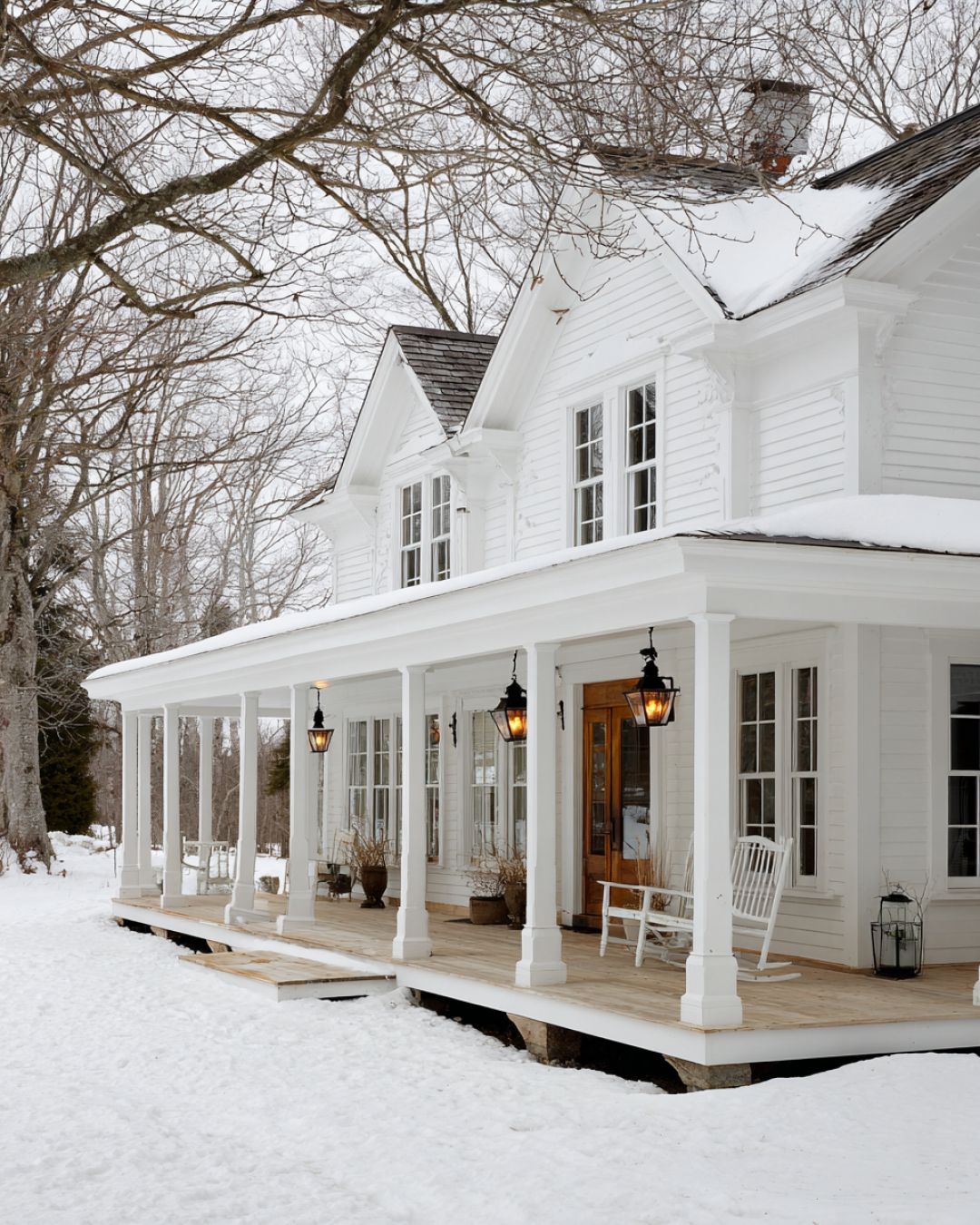 The exterior of this farmhouse is a picturesque dream, painted in a pristine white that beautifully contrasts with the snowy surroundings. A deep wraparound porch is one of its most charming features, offering ample space for relaxation and leisurely afternoons. The porch is adorned with vintage lanterns that cast a warm and inviting glow, creating a welcoming atmosphere. The house's structure is classic and sturdy, with large windows that promise plenty of natural light and connect the interior to the stunning landscape outside.
