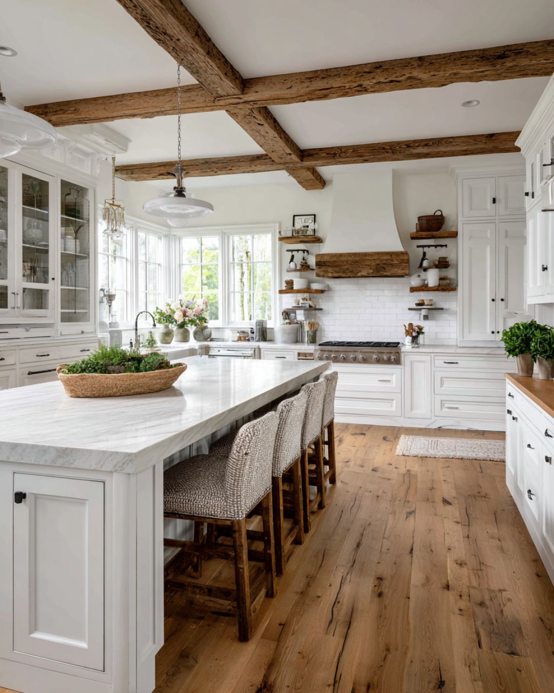 The kitchen is a delightful blend of modern amenities and vintage aesthetics. Crisp white cabinetry and rustic open shelving provide ample storage, while a large farmhouse sink and an impressive range cater to culinary adventures. The countertops are crafted from polished stone, offering both beauty and durability. A central island with bar seating invites casual meals and conversations, and the overall layout ensures functionality without sacrificing style.