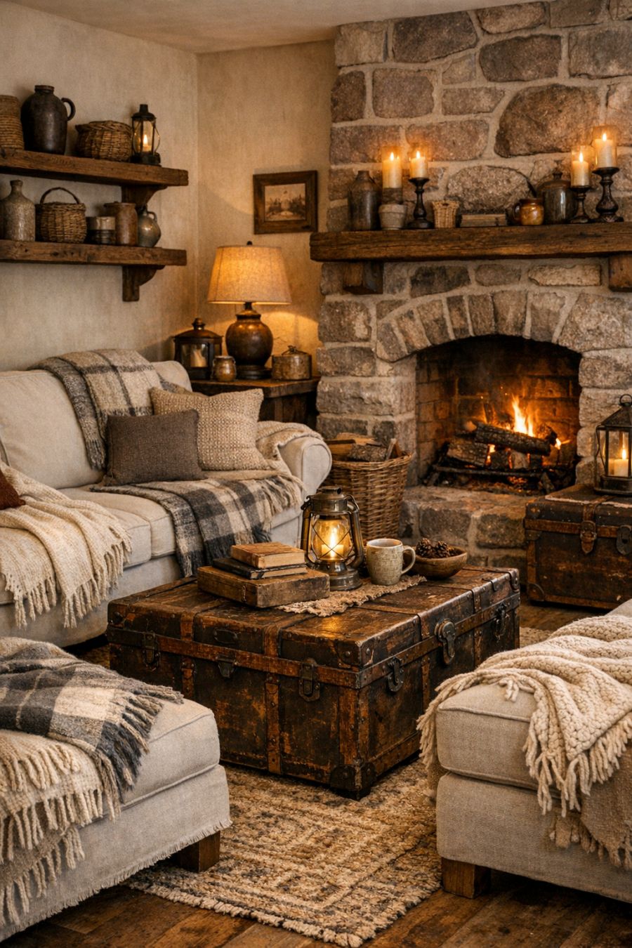 The living area is a sanctuary of comfort, featuring neutral upholstery that sets a calming tone throughout the space. Antique trunks serve as both functional storage and charming coffee tables, adding a touch of vintage elegance. The room is adorned with layered wool throws, draped artfully over sofas and armchairs, inviting relaxation and warmth. Soft, ambient lighting enhances the cozy atmosphere, while carefully selected accent pieces, such as rustic wooden shelves and a stone fireplace, add character and depth to the room.