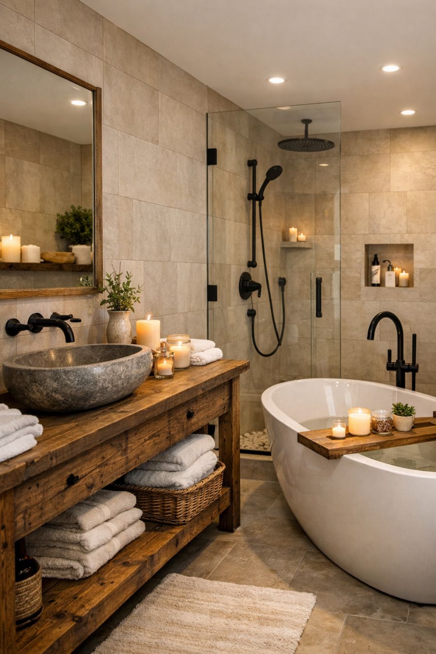The bathroom is a serene retreat, featuring a combination of natural materials and modern amenities. The walls are clad in soft, neutral tiles that complement the sleek fixtures and fittings. A freestanding bathtub offers a luxurious spot for relaxation, while a spacious walk-in shower provides convenience and style. The vanity, crafted from reclaimed wood, adds a rustic touch and is topped with a polished stone sink. Soft lighting and thoughtful details, such as plush towels and fragrant candles, enhance the room's calming atmosphere.