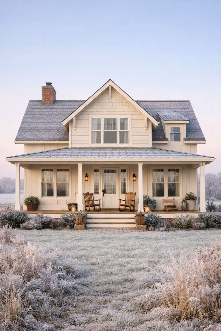The farmhouse's exterior is a picturesque vision with its pale siding that seems to glow softly against the backdrop of frost-kissed fields. The gentle hues of the siding are complemented by a classic gabled roof, creating a timeless silhouette that fits seamlessly into the rural landscape. Large windows punctuate the façade, inviting natural light into the home and offering glimpses of the serene countryside. A welcoming porch, adorned with simple wooden chairs, invites visitors to sit and enjoy the peaceful setting, making it an ideal spot for morning coffee or evening reflection.