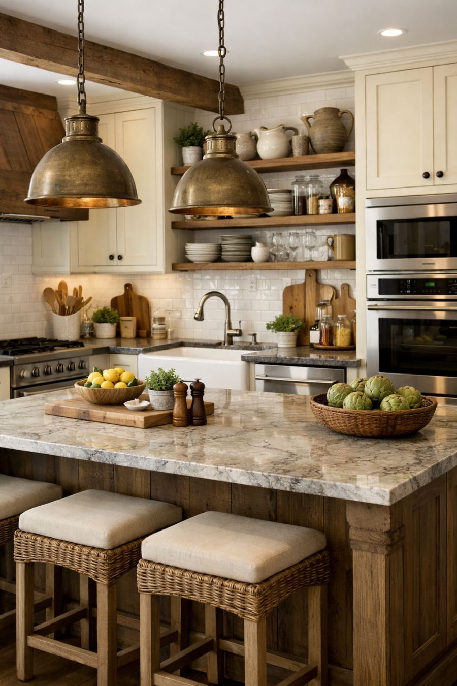 The kitchen is a chef's dream, designed with both functionality and style in mind. Its open layout features a large farmhouse sink and modern appliances seamlessly integrated into classic cabinetry. The countertops are made of polished stone, providing ample workspace and a touch of luxury. Open shelves display an array of rustic crockery and glassware, allowing for easy access and adding to the room's charm. A central island offers additional seating and workspace, making it the heart of the home where culinary creativity can flourish.
