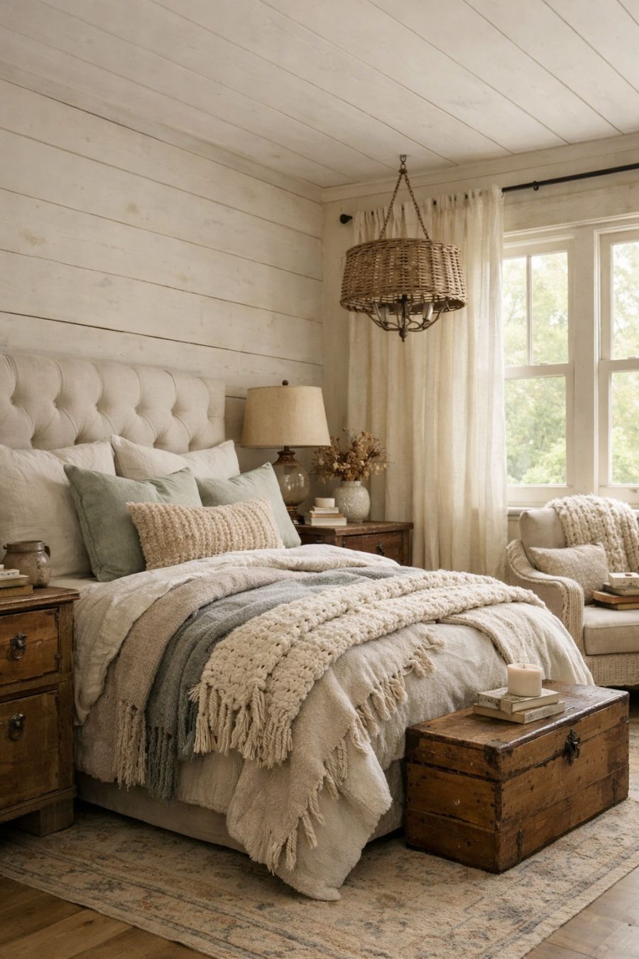 The bedroom is a haven of tranquility, with a palette of soft, muted colors creating a soothing ambiance. The centerpiece is a plush bed, adorned with layered wool throws and an array of pillows that invite rest and relaxation. Antique wooden chests serve as bedside tables, offering storage and adding a vintage touch. Large windows draped with light, airy curtains allow natural light to flood the room, while a comfortable reading nook in the corner provides a perfect spot for quiet reflection.