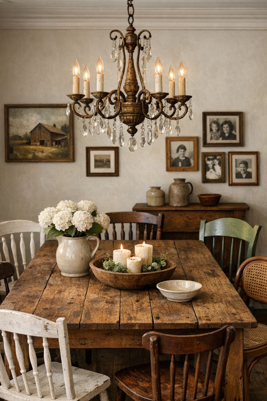 The dining area is a blend of rustic charm and understated elegance, centered around a sturdy wooden table that can comfortably accommodate family gatherings and intimate dinners alike. Surrounding the table are mismatched chairs, each with its own story and character, adding a whimsical touch to the space. A vintage chandelier hangs overhead, casting a warm glow and highlighting the natural grain of the table. The walls are adorned with simple artwork and framed family photographs, creating a personal and inviting atmosphere.