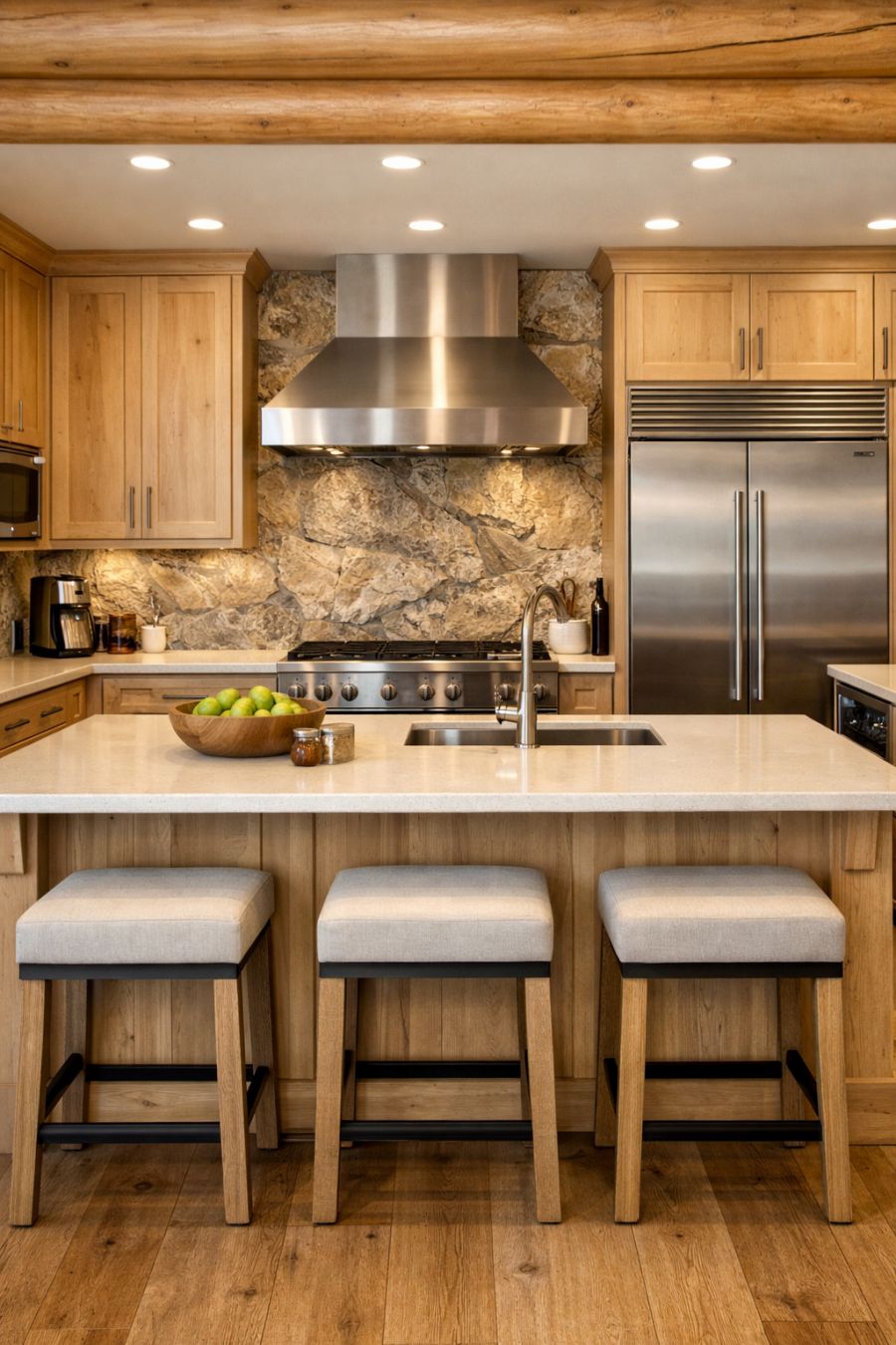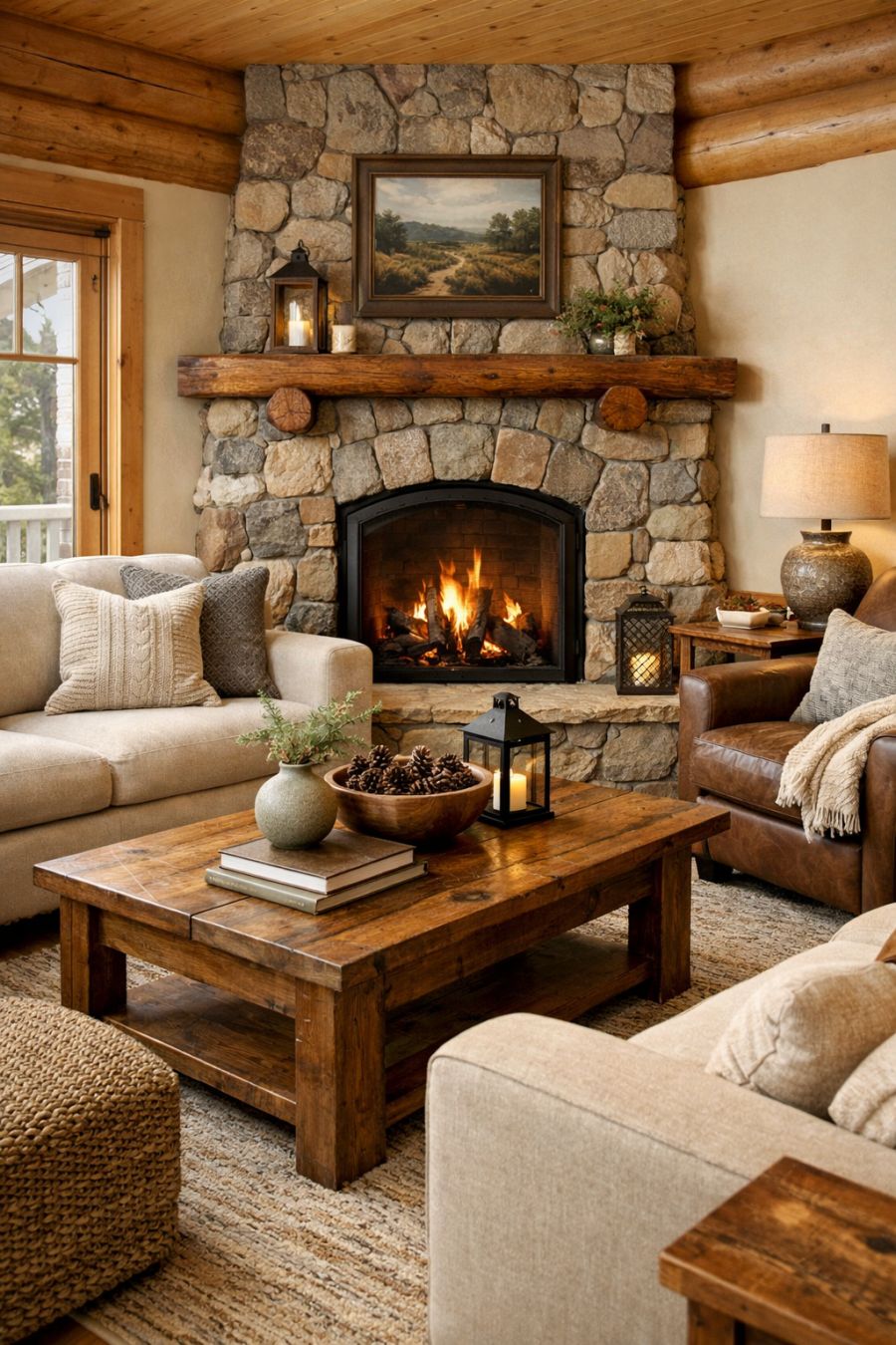Upon entering the living area, you're greeted by an open and airy space that feels both cozy and expansive. The cream-toned walls reflect the abundant natural light, enhancing the sense of openness. A large stone fireplace serves as the focal point, providing warmth and a touch of rustic charm. The furnishings are a blend of modern and traditional, with plush sofas and armchairs arranged to encourage conversation and relaxation. Natural wood accents and soft textiles create a serene atmosphere that invites you to unwind.