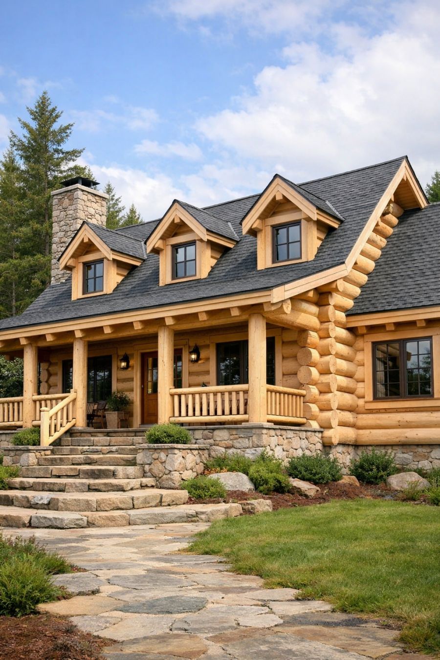 The exterior of this concept home is a testament to the beauty of simplicity and natural materials. The pale logs used in the construction lend a bright and welcoming appearance, ensuring that the home stands out against its natural surroundings. Charming dormer windows punctuate the sloping roofline, adding character and allowing natural light to flood into the upper levels of the home. Stone entry steps lead to a wide, inviting front porch that beckons you to step inside and explore further.