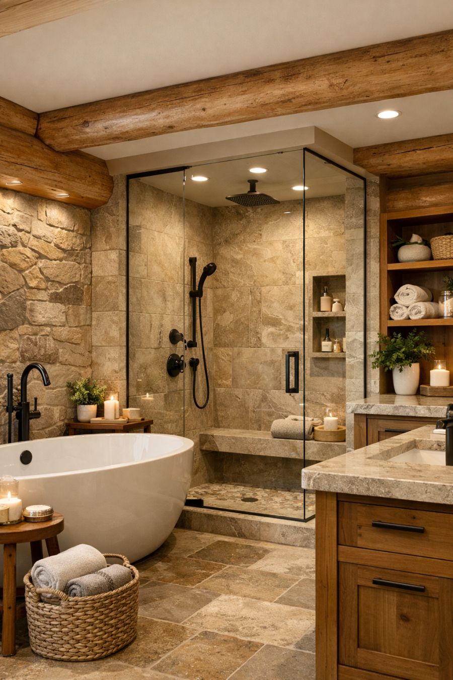 The bathroom exudes a spa-like tranquility, with natural stone and wood elements creating a harmonious, organic feel. The color scheme is soft and calming, featuring neutral tones that enhance the sense of relaxation. A large soaking tub and a walk-in shower provide luxurious options for bathing, while sleek, modern fixtures add a touch of sophistication. Thoughtful storage solutions ensure that the space remains uncluttered and functional.