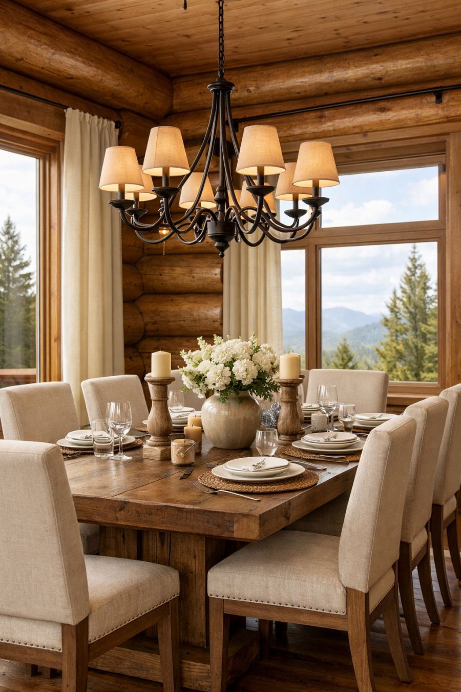 The dining area strikes a perfect balance between elegance and comfort, with a large wooden dining table set beneath an understated, yet striking chandelier. The chairs are upholstered in a soft, neutral fabric that complements the cream tones of the walls. Large windows frame the space, offering views of the surrounding landscape and allowing natural light to enhance the dining experience. Simple yet sophisticated tableware and decor elements add to the understated elegance of the room.