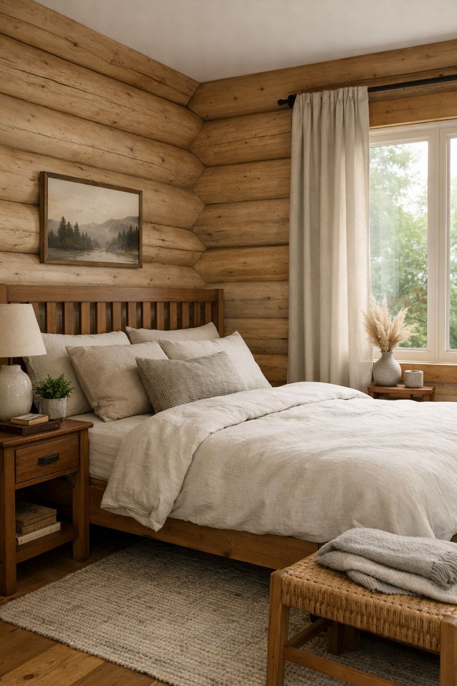 In the bedroom, the light-toned log walls create a serene and calming atmosphere, perfect for rest and relaxation. The room is furnished with a simple yet elegant wooden bed, dressed in neutral linens that enhance the natural color palette. A large window allows for plenty of natural light, while soft drapes provide privacy when needed. Minimalist décor and carefully selected accessories add a touch of sophistication without overwhelming the tranquil setting.