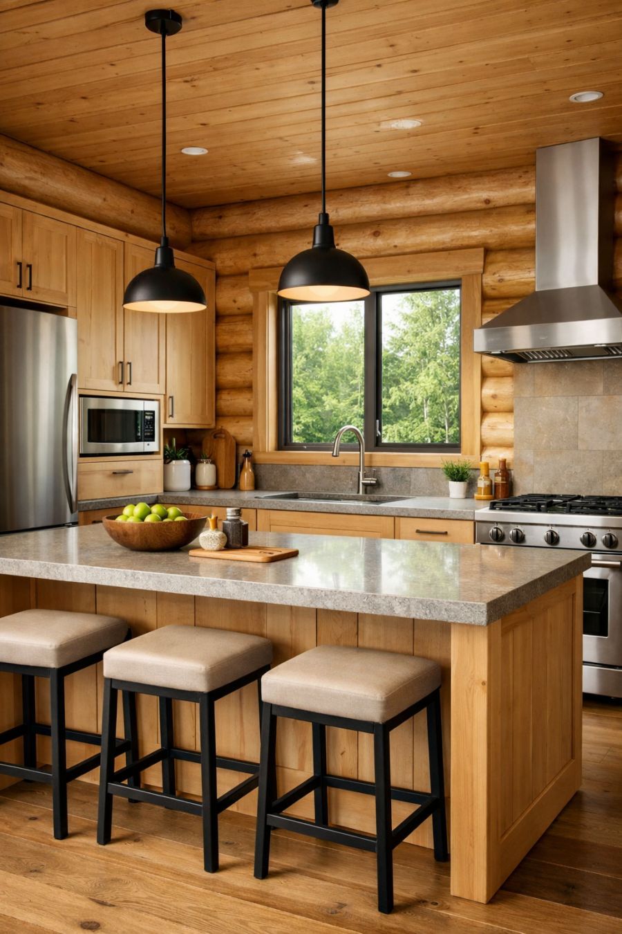 The kitchen is a harmonious blend of functionality and style, featuring a minimalist design that highlights the natural beauty of the materials. Light wooden cabinetry complements the smooth log walls, while stainless steel appliances add a modern touch. The countertops are crafted from polished stone, providing ample workspace and a sleek contrast to the warm wood. An island with bar seating offers a casual spot for quick meals or entertaining guests, and large windows ensure that the space is always bright and inviting.