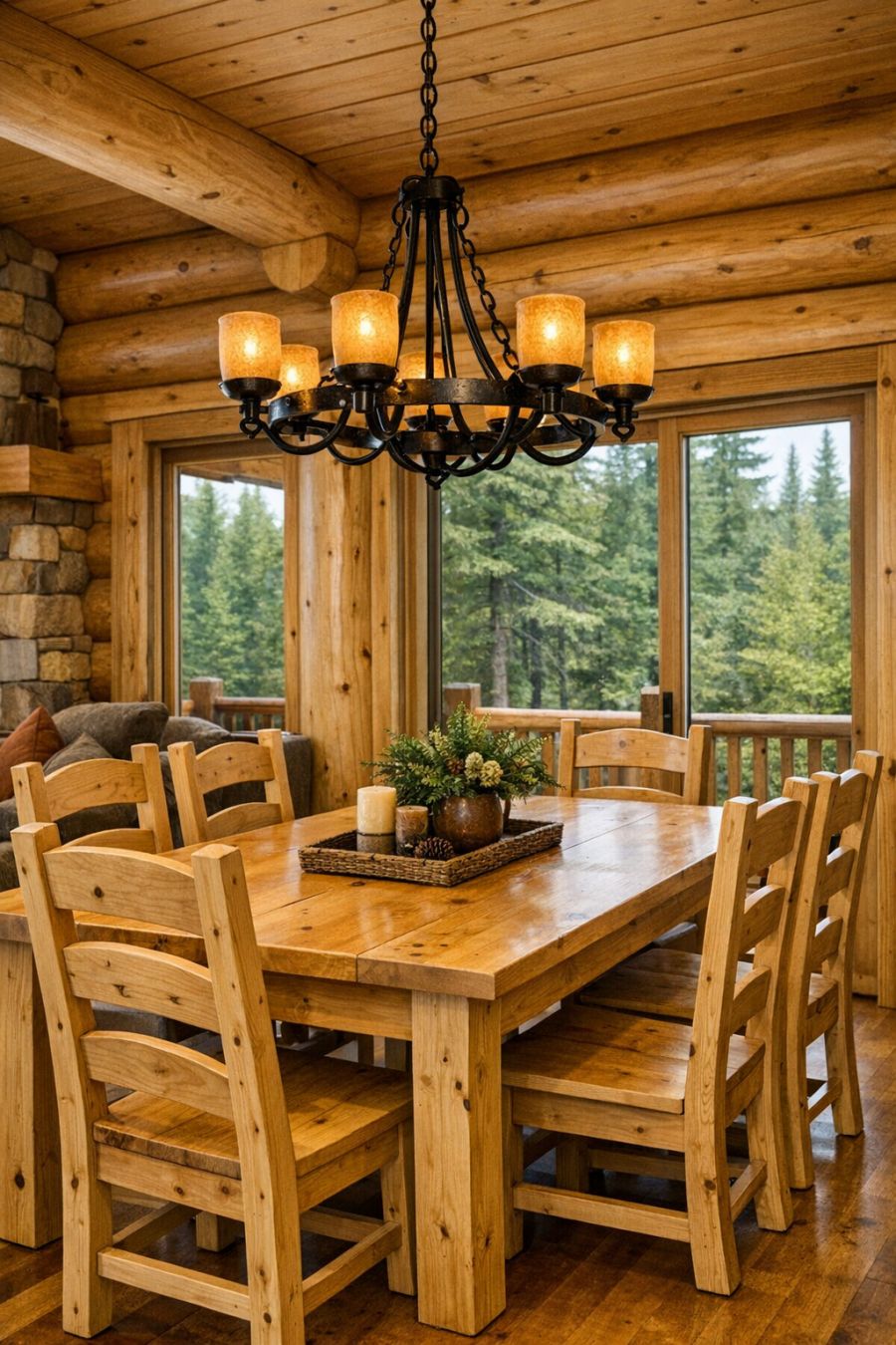 The dining area continues the theme of natural beauty and simplicity, with a solid wood table that comfortably seats six. The chairs are crafted from the same light-toned pine as the home's logs, ensuring a cohesive aesthetic. Overhead, a wrought iron chandelier provides ambient lighting, and large windows frame a picturesque view of the surrounding forest. The space is designed for both intimate family meals and larger gatherings, offering a seamless connection to the living area.