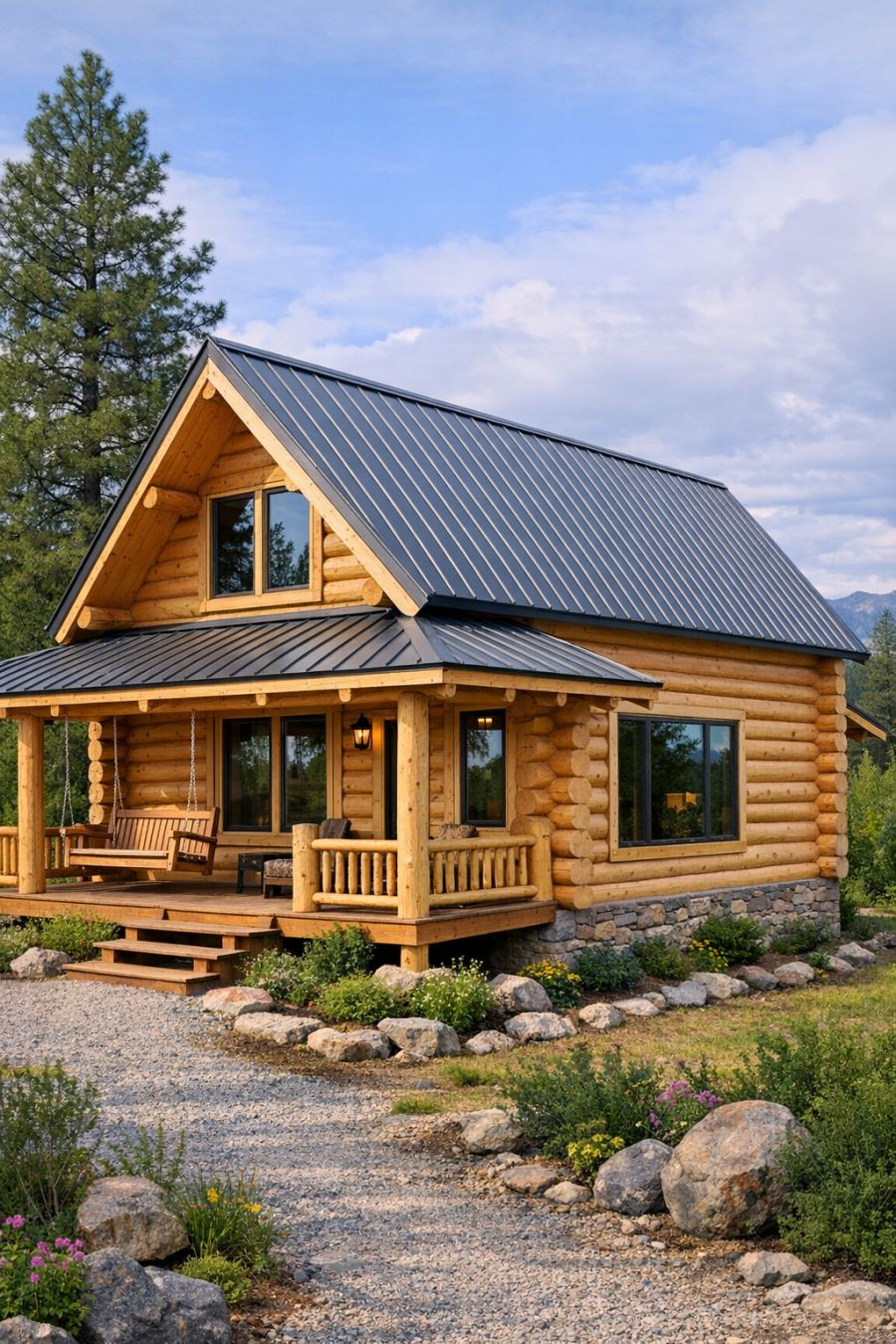 The exterior of this log home is a testament to the beauty of natural materials. Its soft pine logs are a warm, light tone, giving the house a gentle appearance that complements the surrounding landscape. A simple metal roof adds a modern touch, providing both durability and a sleek contrast to the rustic wood. At the front, a welcoming porch swing invites you to sit and enjoy the peaceful surroundings, while large windows allow natural light to flood the interior and provide stunning views of the outdoors.