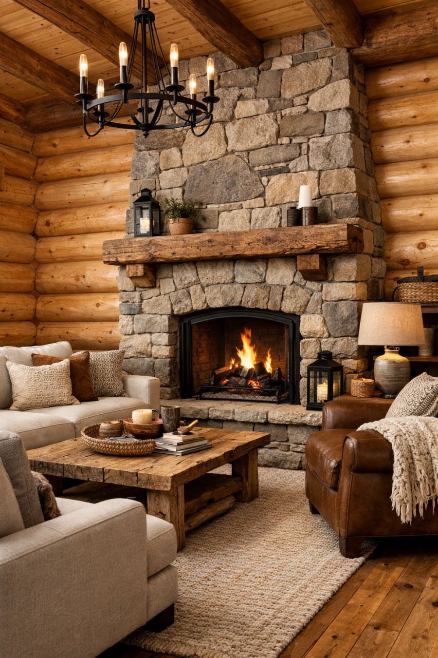 The living area of this home exudes warmth and comfort, with smooth light-toned log walls creating a cozy yet spacious ambiance. The high ceiling, adorned with exposed wooden beams, adds to the airy feel of the space. A large stone fireplace serves as the focal point, offering both warmth and a touch of rustic elegance. The furnishings are a blend of modern simplicity and rustic charm, with plush seating and natural textures that invite relaxation and conversation.