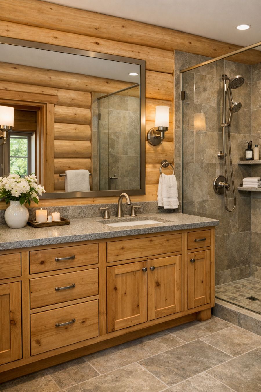 The bathroom is a sanctuary of style and functionality, featuring a design that prioritizes comfort and elegance. Smooth stone tiles line the floor and shower, complementing the light-toned log walls. The vanity, crafted from the same pine as the rest of the home, offers ample storage and is topped with a sleek stone countertop. Modern fixtures in brushed nickel add a touch of luxury, while a large mirror enhances the sense of space and light. The overall atmosphere is one of calm and rejuvenation, providing a perfect retreat within the home.