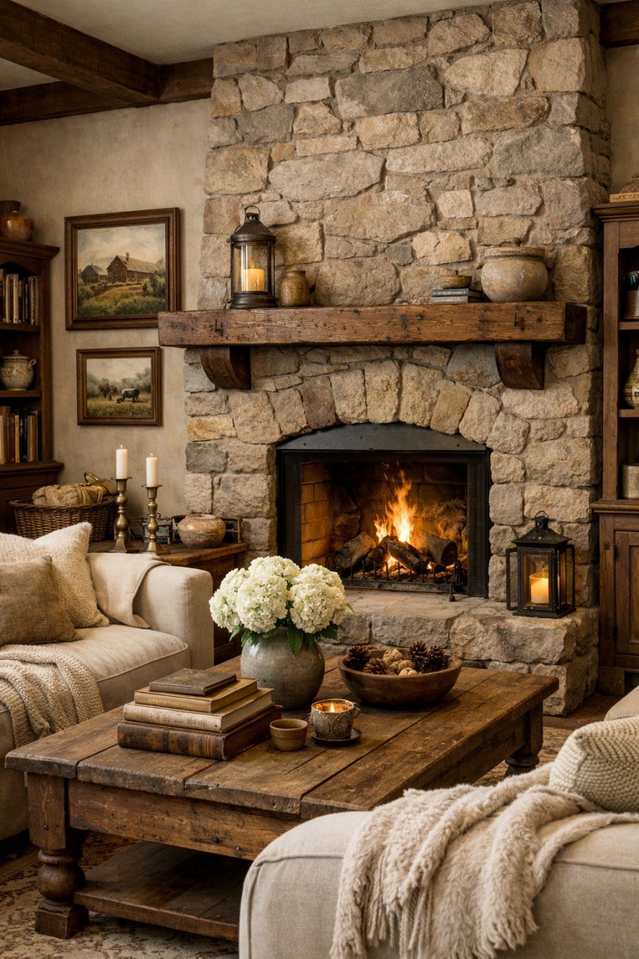 Upon entering the living area, one is immediately struck by the harmonious blend of traditional silhouettes and modern comfort. Soft cotton throws are casually draped over a plush, neutral-toned sofa, offering warmth and a touch of texture. Antique wood finishes on the coffee table and bookshelves exude a sense of history and character, while a large, stone fireplace serves as the room's centerpiece. The walls are adorned with carefully selected artwork that reflects the countryside theme, tying the space together with a subtle elegance.