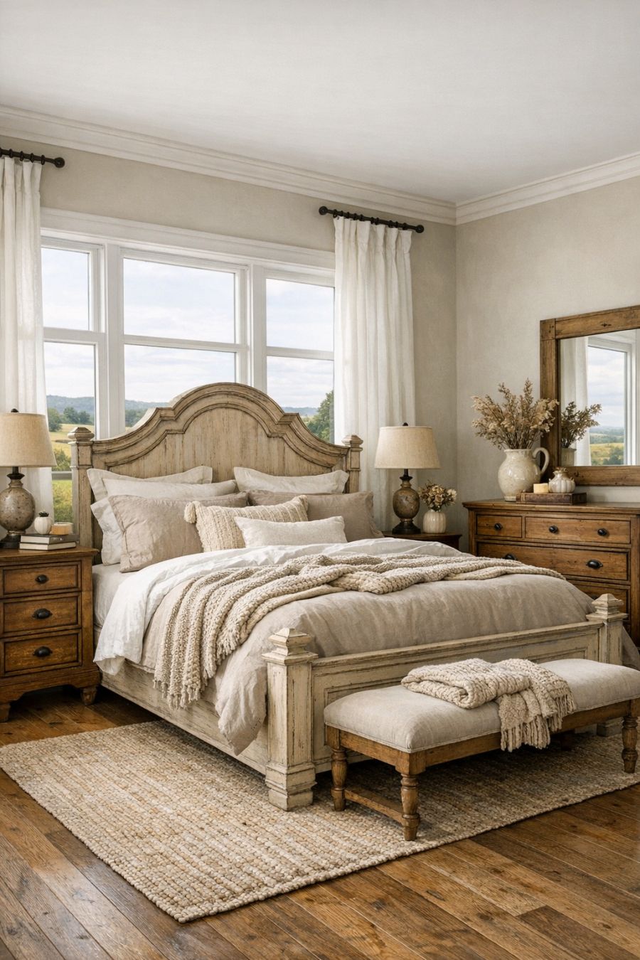 The bedroom is a sanctuary of peace and comfort, featuring a harmonious blend of traditional and contemporary design elements. The room is anchored by a grand, antique-finished bed frame, complemented by soft cotton throws and plush bedding in soothing, neutral tones. Large windows offer breathtaking views of the countryside, allowing natural light to fill the space during the day and providing a serene backdrop at night. Elegant wooden furniture pieces, such as a classic dresser and nightstands, complete the look, creating a space that is both restful and refined.
