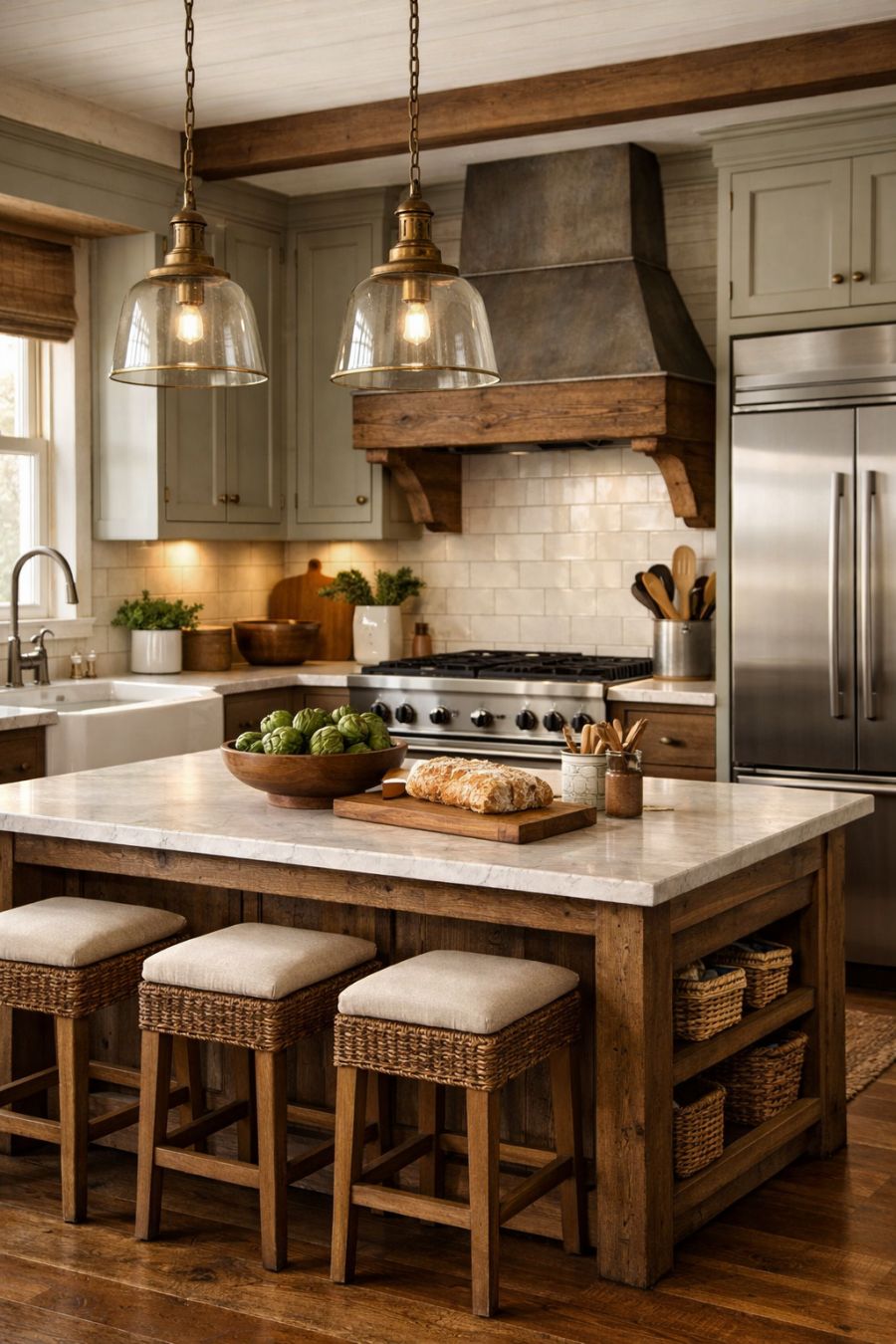 The kitchen is a chef's dream, combining functionality with timeless style. Custom cabinetry in a soft, muted hue seamlessly blends with antique wood finishes, providing ample storage while maintaining an air of classic sophistication. A large farmhouse sink and state-of-the-art appliances are nestled among sleek countertops, offering both practicality and luxury. A central island doubles as a prep area and informal dining spot, making it the heart of the home where family and friends can gather and enjoy each other's company.