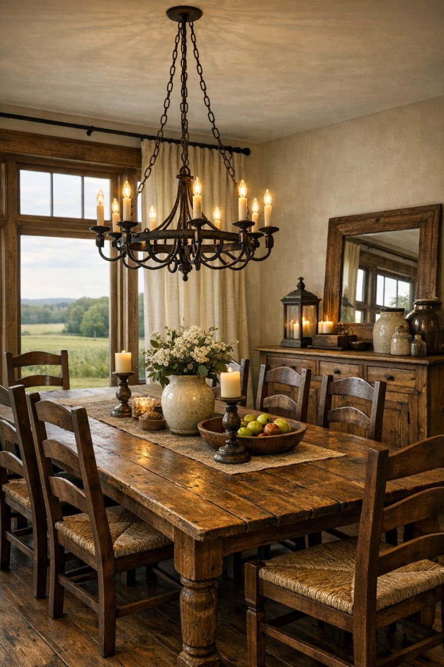 The dining area is a perfect blend of rustic charm and refined style, featuring a long wooden table that can comfortably seat family and friends for any occasion. The table's antique finish adds a touch of history, complemented by traditional wooden chairs and a vintage sideboard. Overhead, a wrought-iron chandelier casts a warm glow, enhancing the room's cozy atmosphere. Large windows frame the space, offering uninterrupted views of the surrounding landscape and allowing natural light to flood the room, creating an inviting setting for memorable meals.