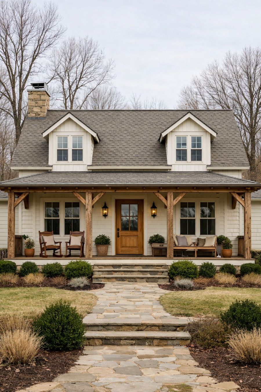 The exterior of this countryside farmhouse is a vision of understated elegance, with its light siding that captures the gentle hues of the surrounding landscape. The home is nestled among bare trees, offering picturesque views that change with the seasons, from the skeletal beauty of winter to the lush fullness of spring. A welcoming front porch invites guests to linger, with its rustic wooden beams and charming rocking chairs. The roof, with its subtle pitch and classic shingles, adds to the timeless appeal, making the house appear both stately and inviting.