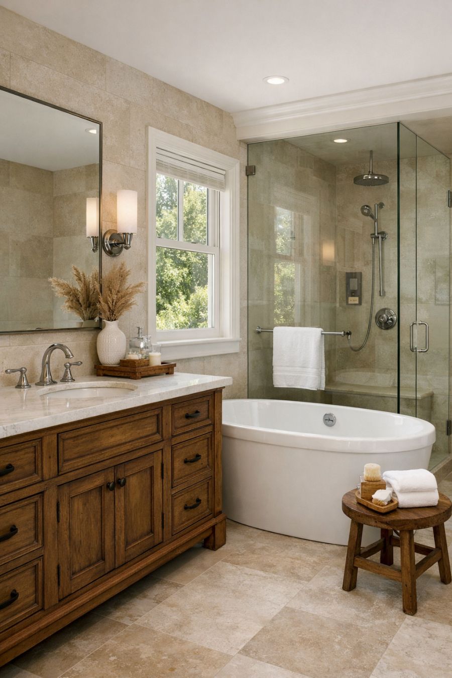 The bathroom exudes a spa-like serenity with its careful selection of materials and fixtures. Light-colored stone tiles cover the floors and walls, reflecting the natural light from a generously sized window and creating an open, airy feel. A freestanding bathtub invites relaxation, while a separate glass-enclosed shower offers modern convenience. The vanity, with its antique wood finish and elegant countertop, provides ample storage and style. Chrome fixtures and understated lighting complete the look, balancing functionality with a timeless aesthetic.